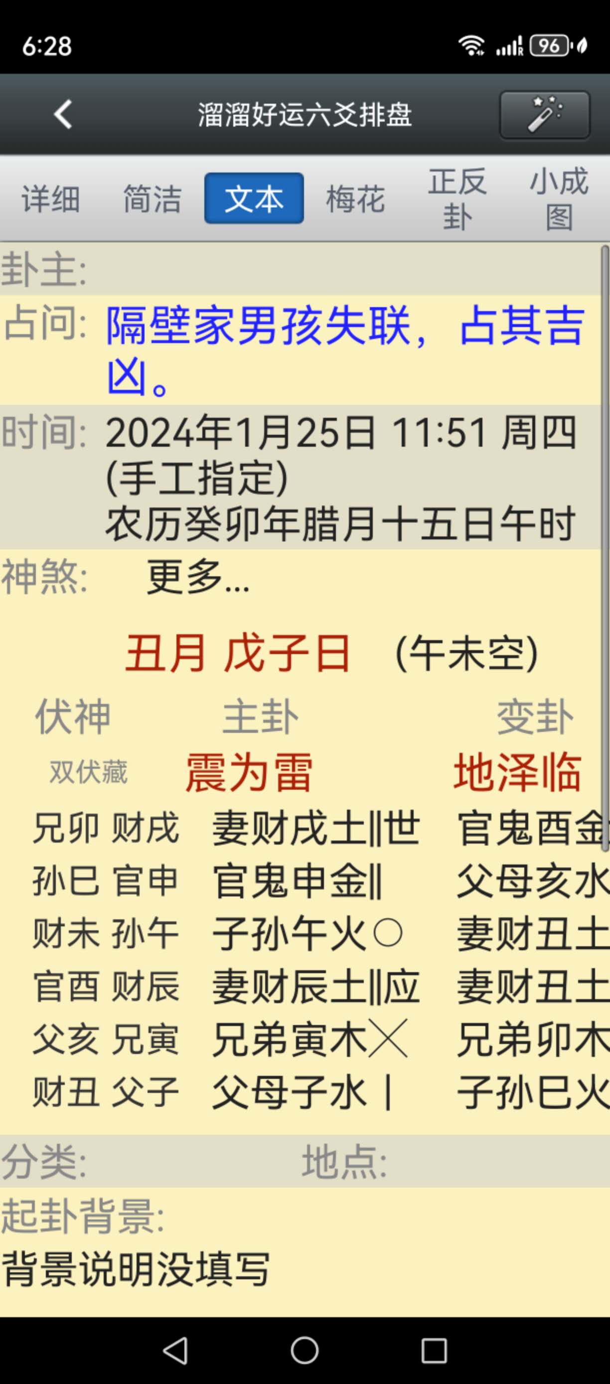 学生甲:这个卦的背景,是昨晚我高中同学发朋友圈说,他朋友家的小孩失联一天了,联系不上。今早我又问他,他说还是没有找到,于是我起卦问这孩子的吉凶。