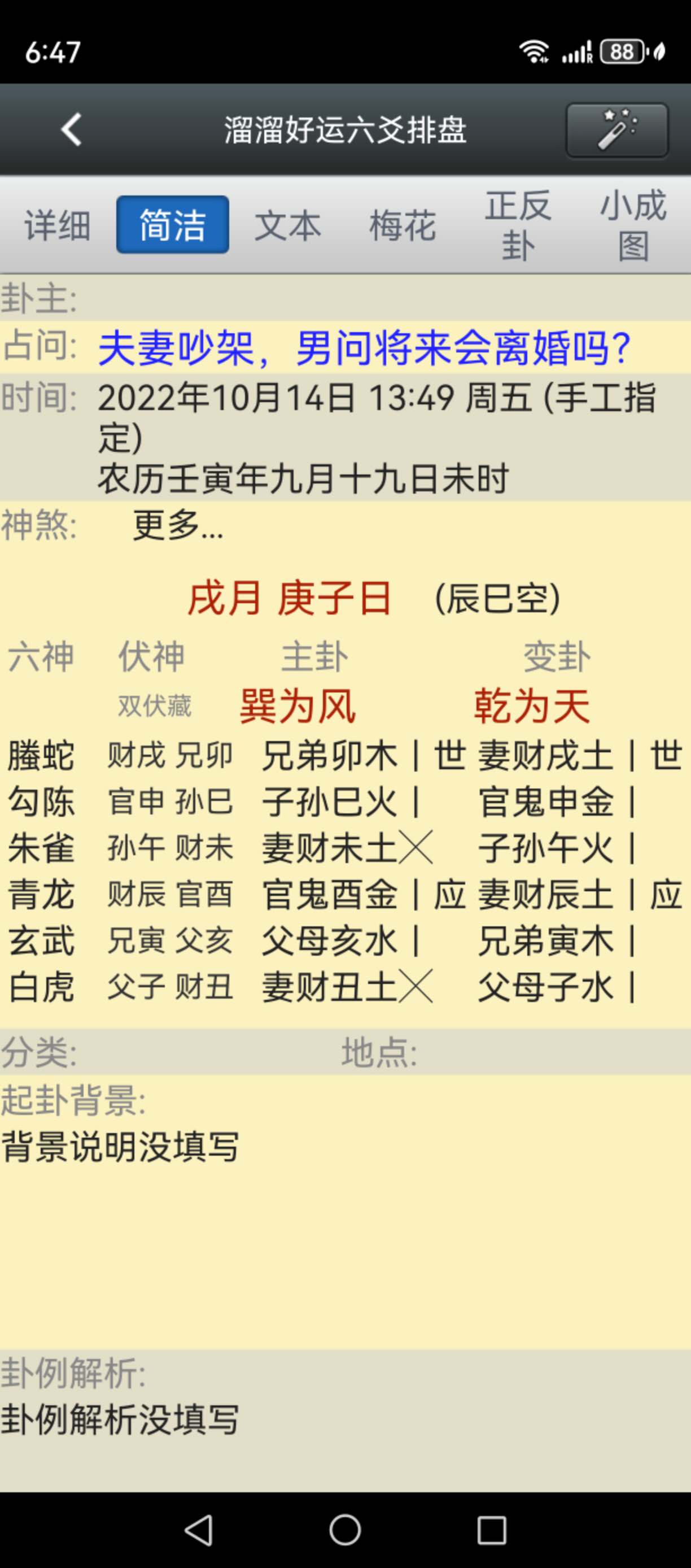 学生:卦背景就是他们夫妻吵架,卦题就是他问以后会不会离婚。问下一步会出现什么情况。